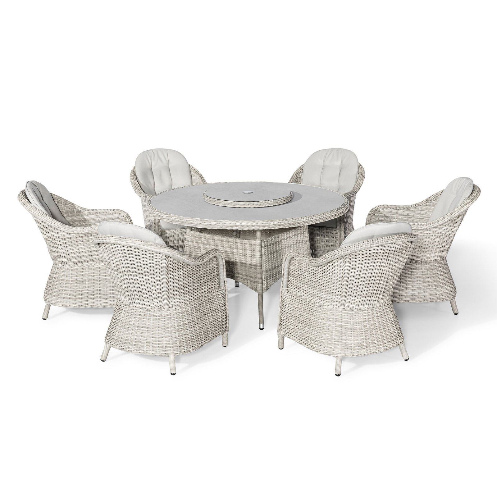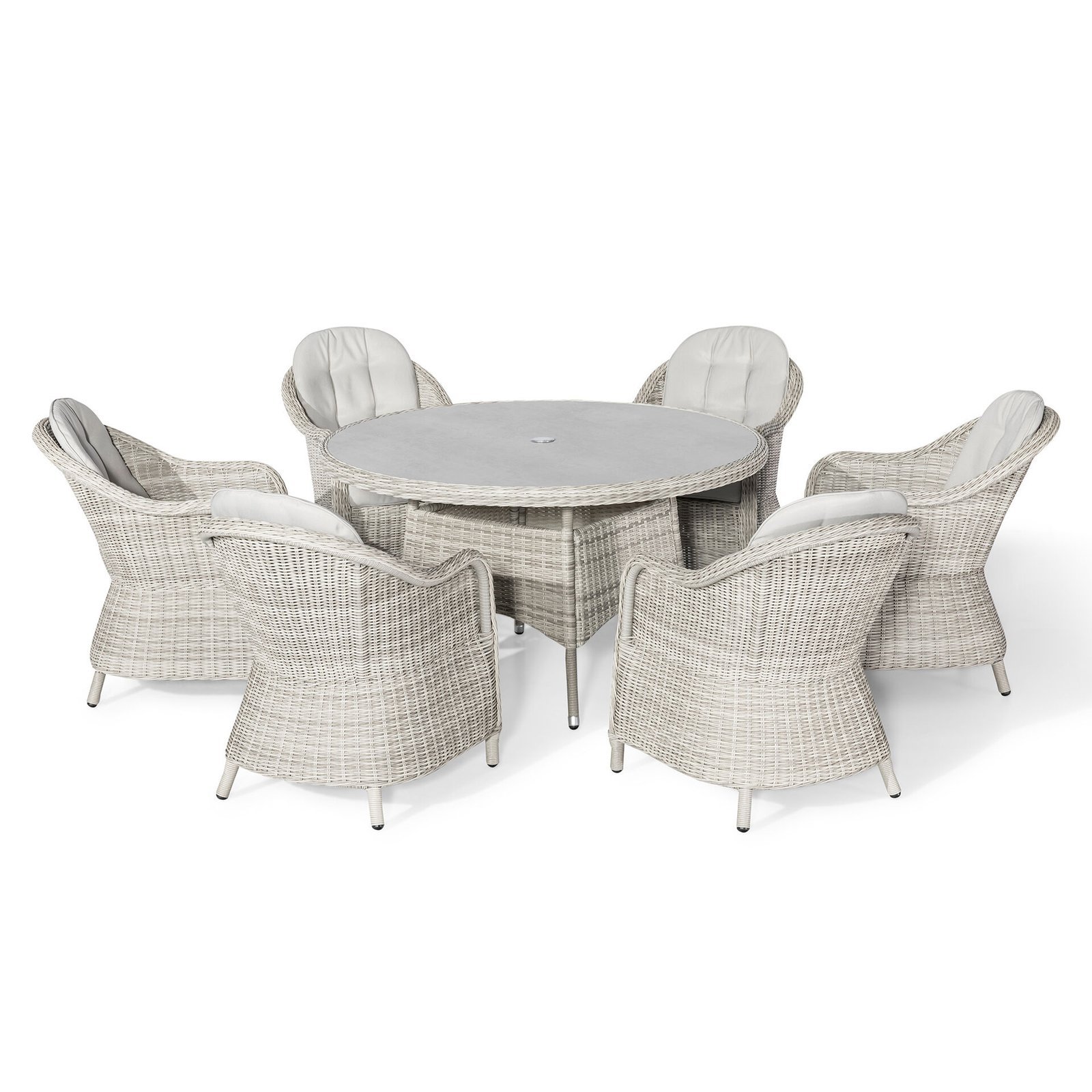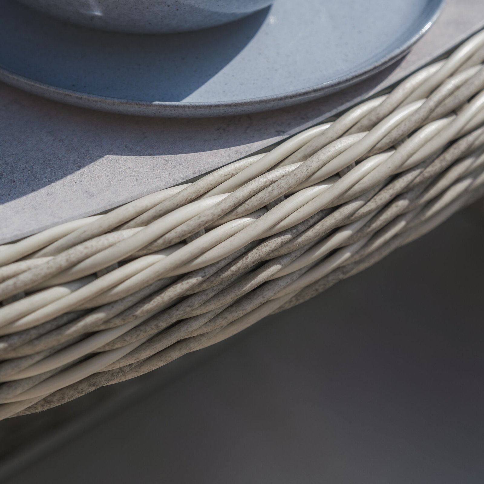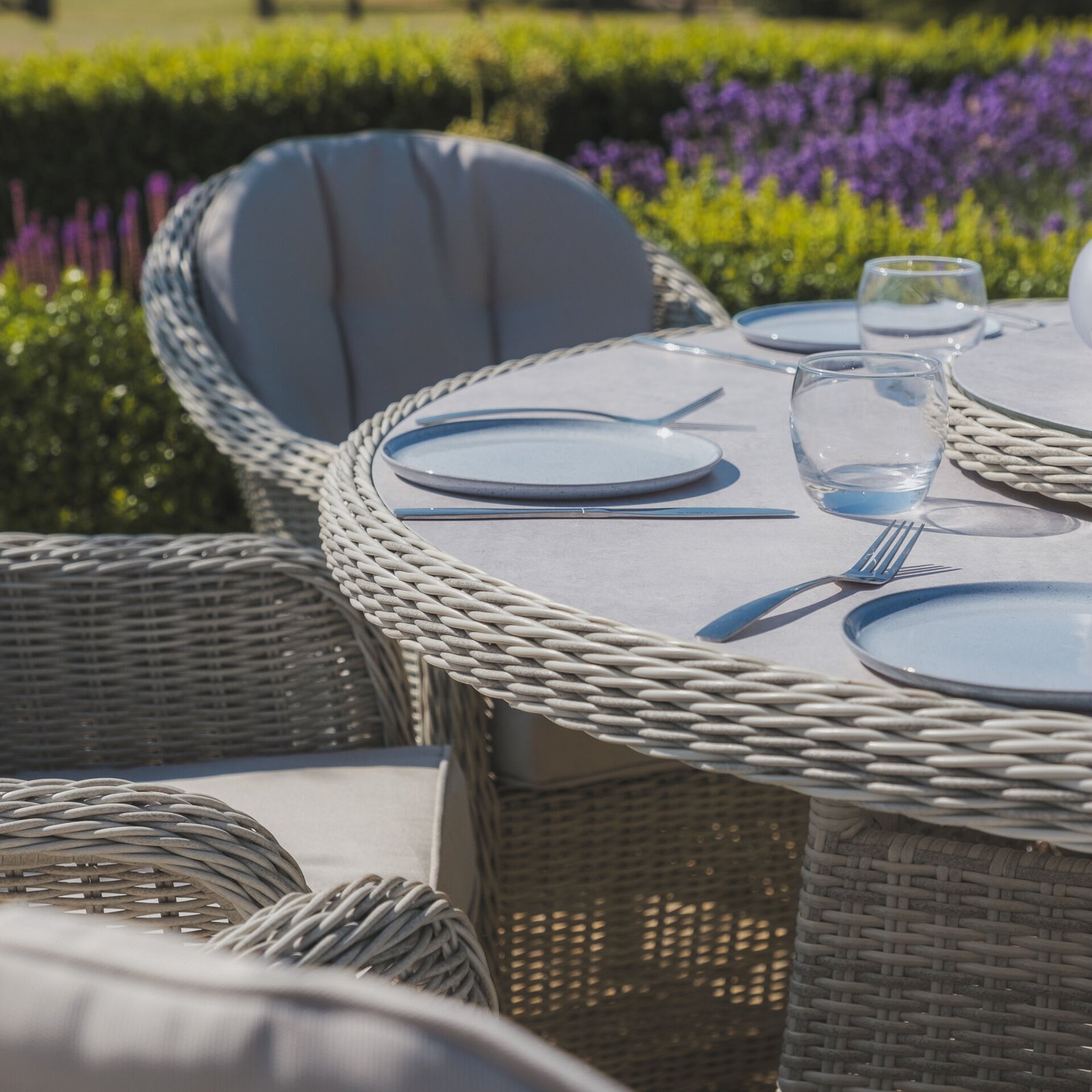 Bring refined elegance and everyday comfort to your outdoor space with the Maze Oxford 6 Seat Round Rattan Dining Set with Heritage Chairs. Expertly crafted with a classic rounded weave using high-quality polyethylene (PE) rattan, this luxurious set blends traditional charm with modern durability. The centrepiece is a beautifully designed round dining table featuring a sleek light grey ceramic top—an effortlessly stylish and easy-to-clean surface that enhances any garden or patio.