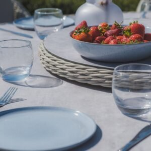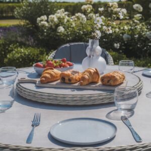 The robust powder-coated aluminium frame guarantees long-term durability and resistance to rust, even through changing weather conditions. An integrated parasol hole allows for convenient shade placement on sunnier days, while the inclusion of a hand-woven lazy Susan adds a functional and stylish touch to the table—perfect for sharing food and drinks with ease.
