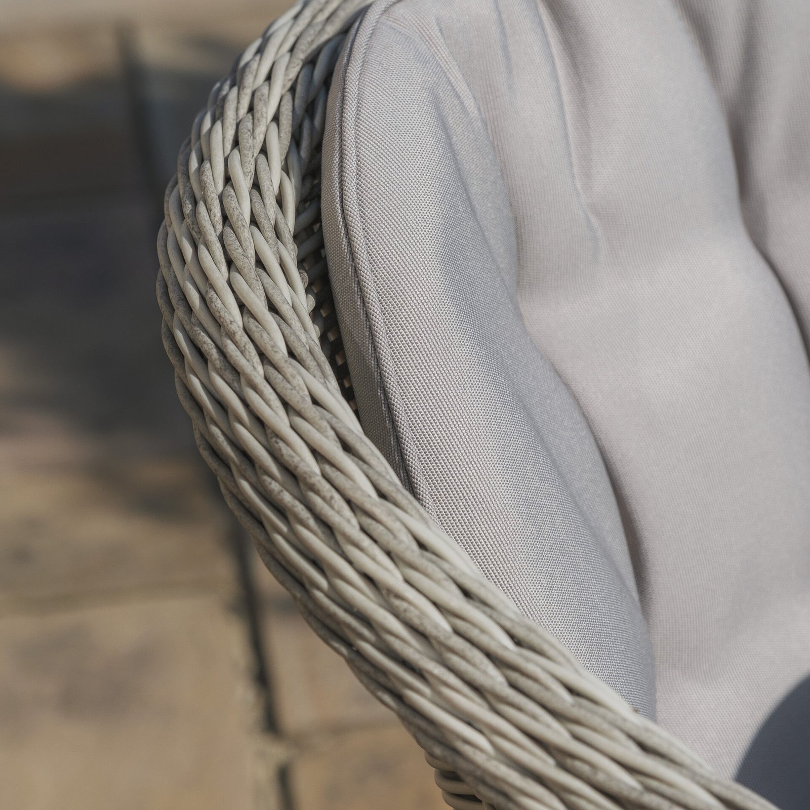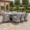A Bellagio Round Wicker Large Corner Casual Dining Set with Rising Firepit Table, Light Grey