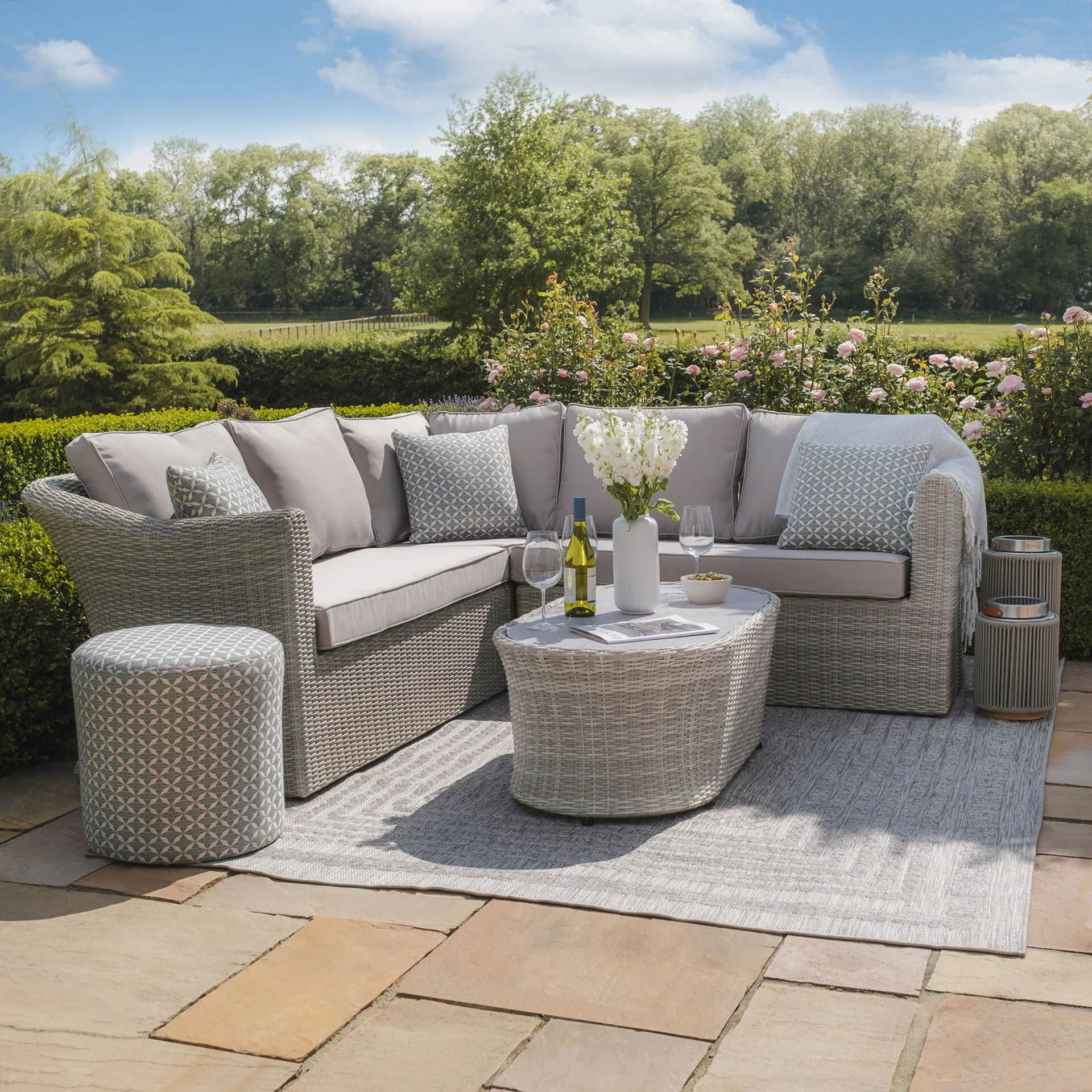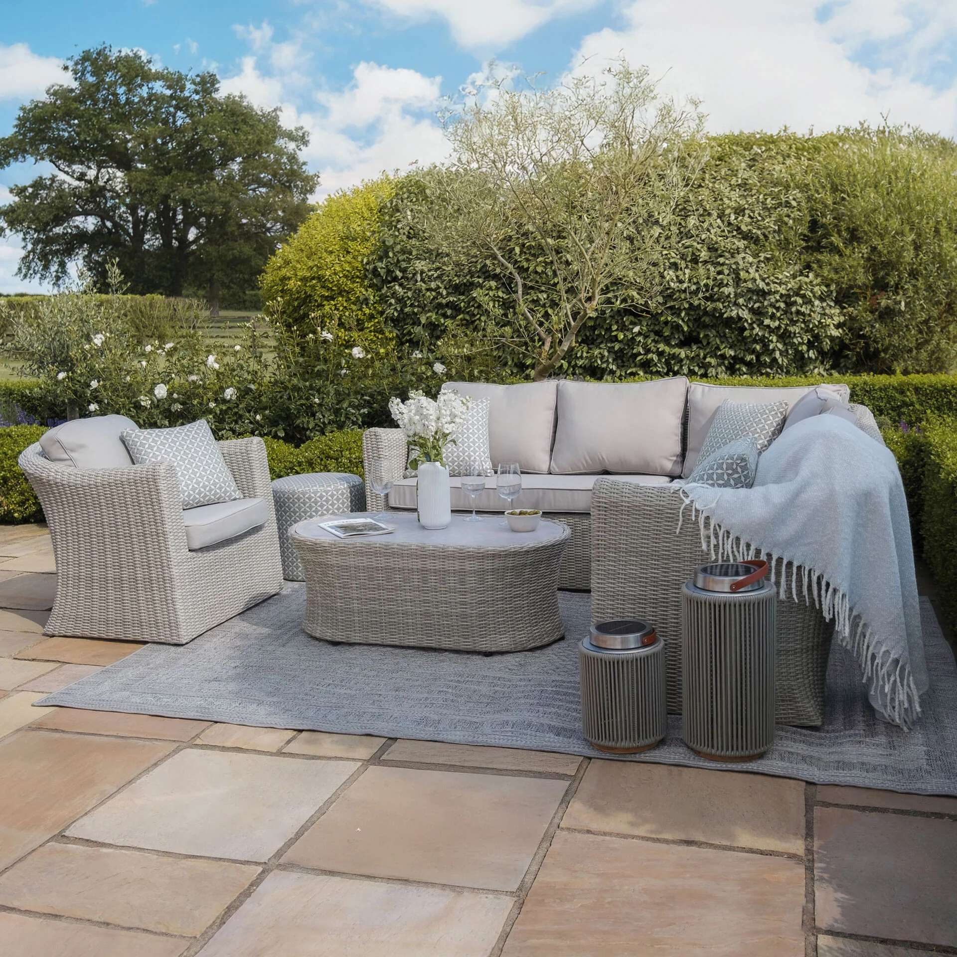 The Maze Oxford Small Rattan Corner Sofa Set with Armchair is a beautifully compact outdoor furniture collection that combines timeless design with contemporary elegance. Part of the renowned Oxford range, it features the signature rounded weave in a sophisticated grey tone, complemented by matching grey cushions to create a stylish and inviting outdoor seating area.