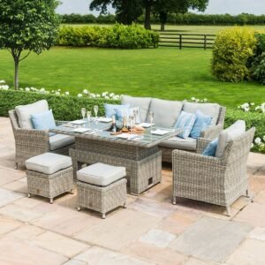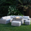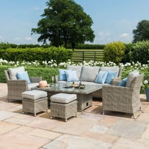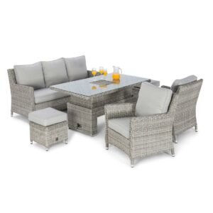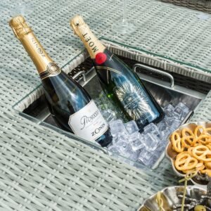 The Oxford Sofa Dining Set with Ice Bucket and Rising Table is a refreshing way to dine in comfort. The three-seat sofa and two armchairs are deep and low slung, the rectangle table includes an ice bucket insert in the middle. To allow even more versatility this set includes the rising table, allowing you to go from dining to lounging. The set also includes two stool style cushioned seats so those extra guests are able to enjoy the meal in luxurious comfort